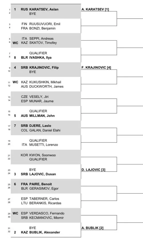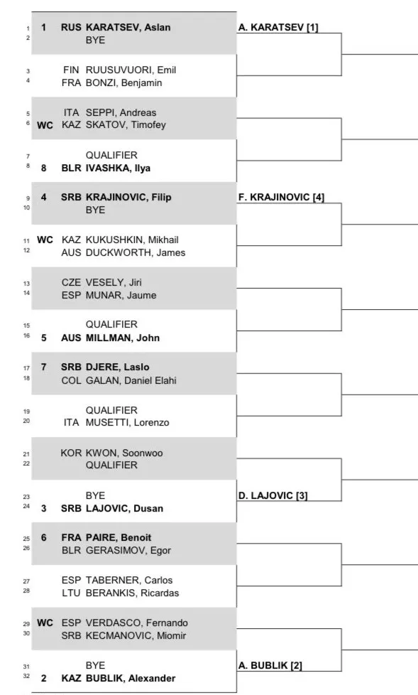 Alexander Bublik also has a BYE but his draw is a bit easier. He will either face Miomir Kecmanovic or Fernando Verdasco in the 2nd round and both should be beatable for Bublik. The native player will hope to advance to the final in order to claim the title and give some joy to the Kazakhstani fans. Check out the draw below.