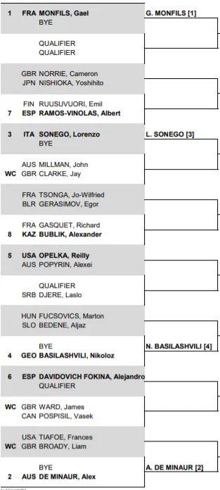 Alex de Minaur who faces either Frances Tiafoe or Liam Broady, one of multiple British wildcards with most receiving main draw for Wimbledon also.