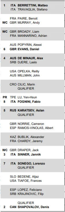 Russian star Aslan Karatsev will also be involved with a qualifier awaiting first before he potentially faces Cameron Norrie if he can get past Albert Ramos-Vinolas.