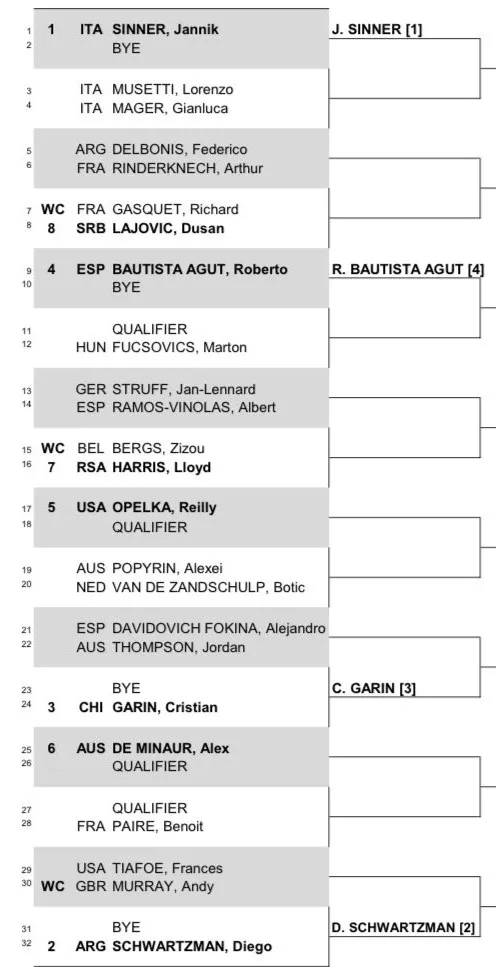 Jannik Sinner who has a 1st round BYE with Lorenzo Musetti potentially waiting in R2. The 2nd seed is
