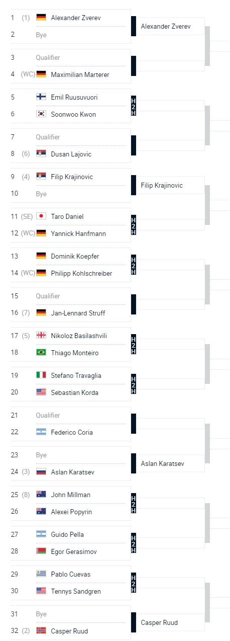 Aslan Karatsev are in the third quarter, followed by John Millman, Alexei Popyrin, Pablo Cuevas and the second seed Casper Ruud, who lead the bottom quarter.