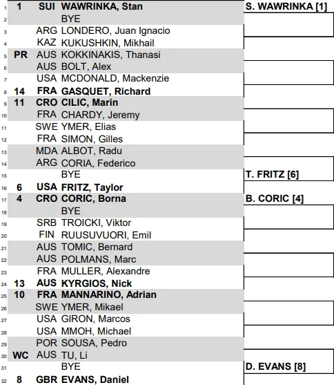 Stan Wawrinka, Taylor Fritz, Borna Coric and Daniel Evans are the players to beat in the top half, with exciting encounters right from the opening round. Nick Kyrgios returns to action against Alexandre Muller, and the winner will face Bernard Tomic or Marc Polmans. Wawrinka and Fritz should battle in the quarters, while Coric, Evans and Kyrgios should decide the second semi-finalist.