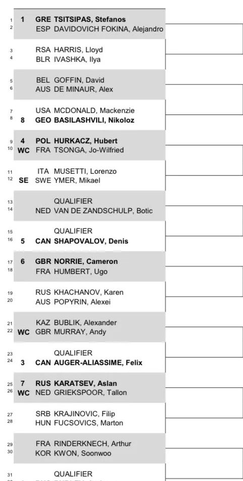 Andrey Rublev and he will face a qualifier who has not yet been named. After that, he will either face Kwon or Rinderkench which is a solid draw compared to Tsitipas who will have tricky opponents early on. Felix Auger-Aliassime as the 3rd seed will also face a qualifier with either Murray or Bublik waiting in round 2.