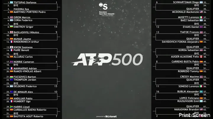 Nonetheless, we have a strong field headlined by last year's finalist Tsitsipas who has a 1st round BYE. In the 2nd round, he will face either Ivashka or Martinez. 2nd seed Ruud also has a BYE and he will face either Nakashima or a qualifier in round 2.