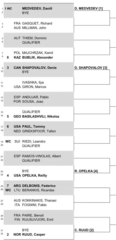 The other half of the draw features defending champion Ruud, who clay-court specialist Fabio Fognini in the quarterfinal. Should the Norwegian get past the Italian, a date with fourth seed Reilly Opelka awaits.