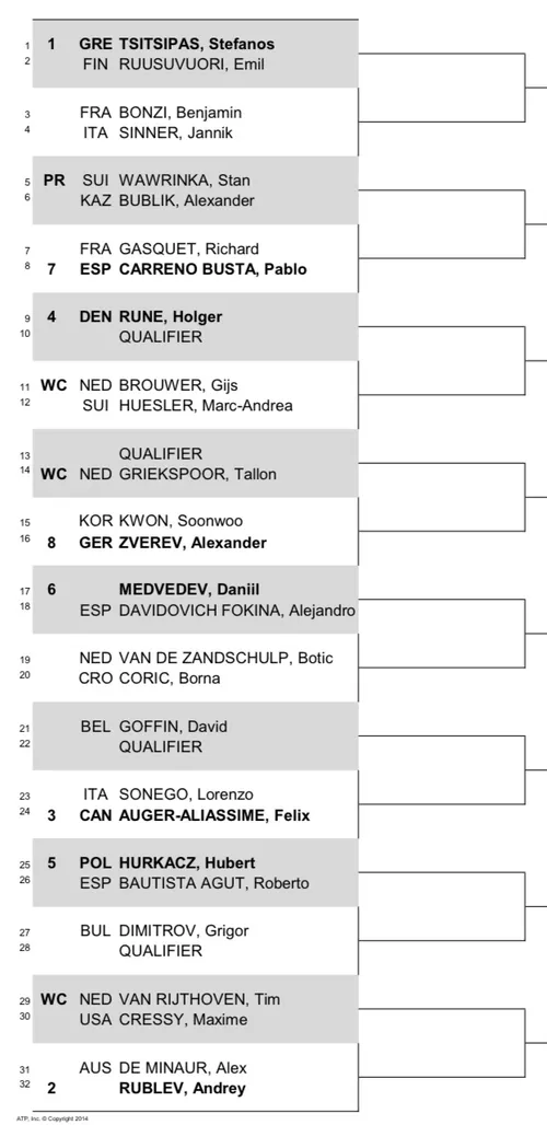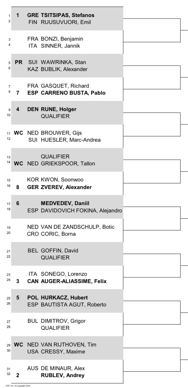 The second seed is Rublev and he opens against de Minaur. Rune will play a qualifier as Auger-Aliassime faces Lorenzo Sonego.