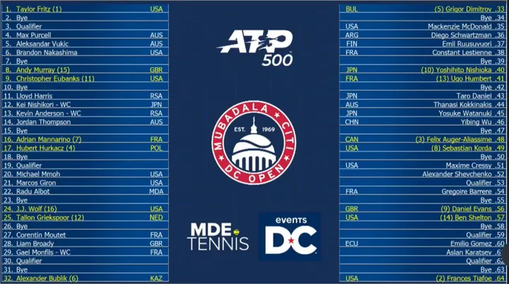 2023 DC Open ATP Draw including Fritz, Tiafoe, Murray, Eubanks, Korda, Shelton