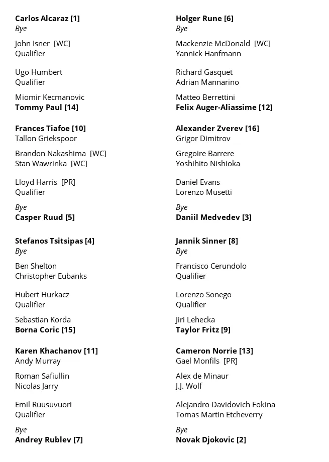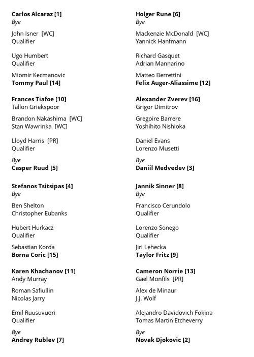 2023 Cincinnati Open ATP Draw (as compiled by DrawsTennis)