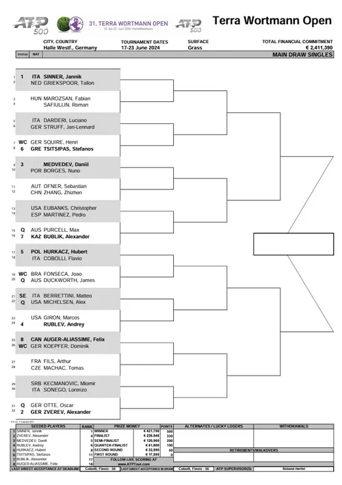 Halle Open, will start on the 17th of June and end on the 23rd of June. The draws for the mega-event, which will officially start on Monday, were announced on Saturday. It features some of the best players in men’s singles