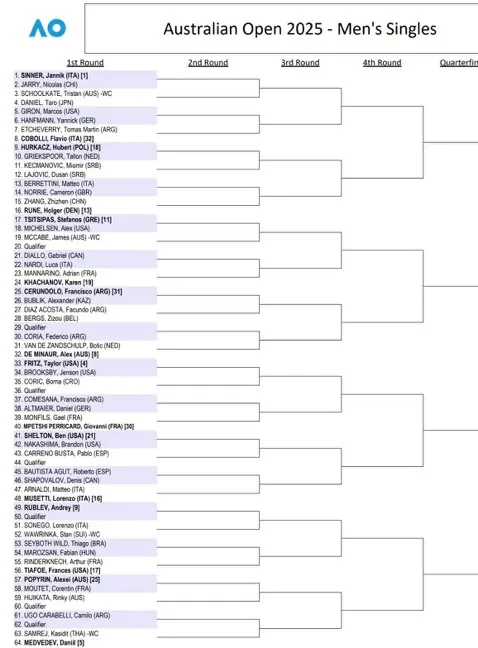 Defending champion Jannik Sinner faces a tough opening round against 2024 Rome Open finalist Nicolas Jarry. The Chilean previously challenged the World No. 1 at the China Open, where their head-to-head record evened to 1-1. Potential fourth-round opponents for the Italian include Hubert Hurkacz or Holger Rune.