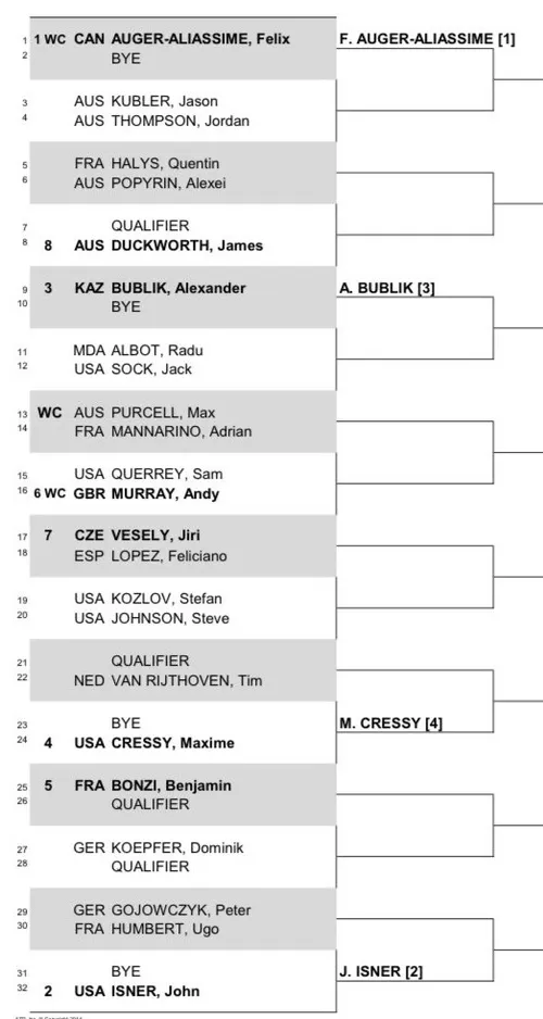 Auger-Aliassime is top seed and will face either Wimbledon success story, Jason Kubler and Jordan Thompson. Murray takes on Sam Querrey.