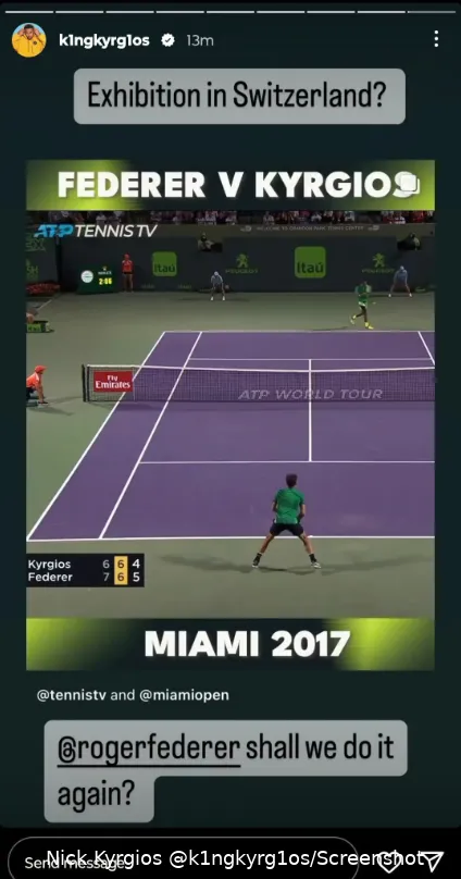 After resharing a clip of his iconic 2017 Miami Open semi-final against Roger Federer, Nick Kyrgios is prepared to go to the great Swiss ace's backyard to play him in an exhibition.