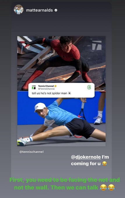 Tennis Channel shared the image of Arnaldi in the split position while facing the back wall of the court on Instagram alongside a photo of Tom Holland's rendition of Spider-Man doing the same move, accompanied by the caption "tell us he's not spider man".