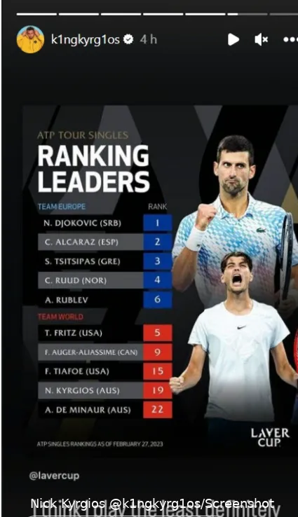 The Laver Cup' s Instagram page shared an image of the Top 5 rankings among players eligible to represent Team Europe and Team World. While their post was intended to congratulate Novak Djokovic on reaching a record 378th week as World No. 1, Nick Kyrgios shared it on his Instagram story and captioned it: