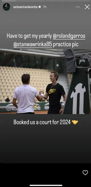 Sebastian Korda and Stan Wawrinka have a tradition ahead of Roland Garros and that's to practice together. They did it last year and they did it this year as well. The American posted a photo from the practice revealing to fans that they already booked a court for the 2024 edition of the event.