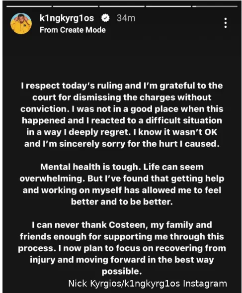 Nick Kyrgios pleaded guilty to his assault charges against his former ex-girlfriend but he wasn't convinced for which he expressed gratitude in a statement following the trial.