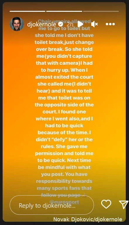 Novak Djokovic hit back at Eurosport for posting about him 'defying' the umpire to go to the bathroom urging the broadcast to check facts before making a post.