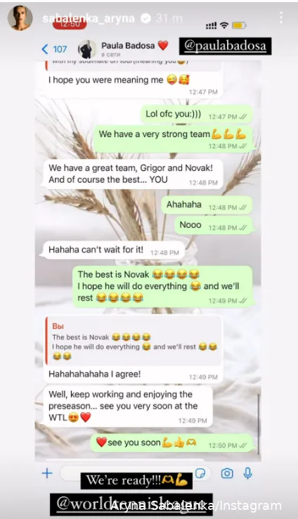 We bring you the transcript of the conversation below. Sabalenka opened with: Hey girl, how is your stay in Dubai? What's your plan for the next weeks?