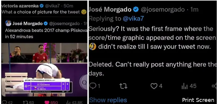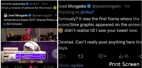 Tennis reporter Jose Morgado updated fans about some scores in Doha as Ekaterina Alexandrova defeated Karolina Pliskova. Morgado usually uses a photo along those posts which he did again but he caught a bad moment with the screenshot as Alexandrova was bent over. Azarenka was not amused and called it out which earned her praise from tennis fans.