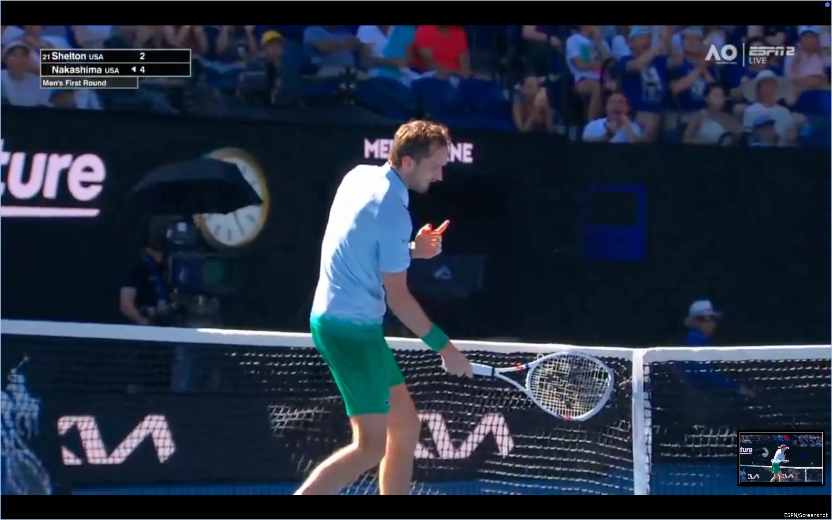 Medvedev as he went two sets down decided to run up to the net and smash it including the net camera as he obliterated his racquet and showed an aggressive side.