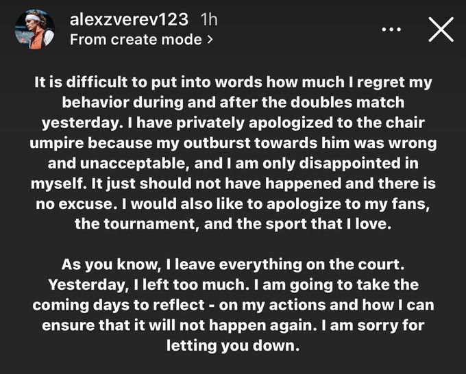 On his social media, Zverev released a statement apologising and saying he left too much out on court.