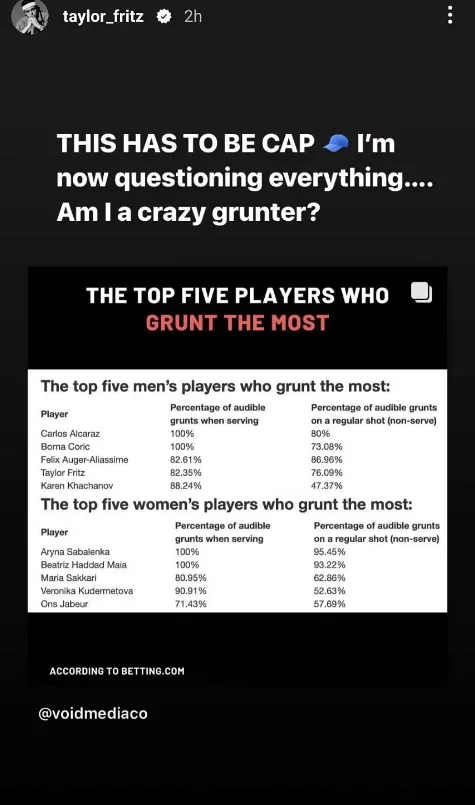 Betting.com did research and placed Fritz fourth on a list of men's tennis players that grunt the most with Alcaraz topping the list.