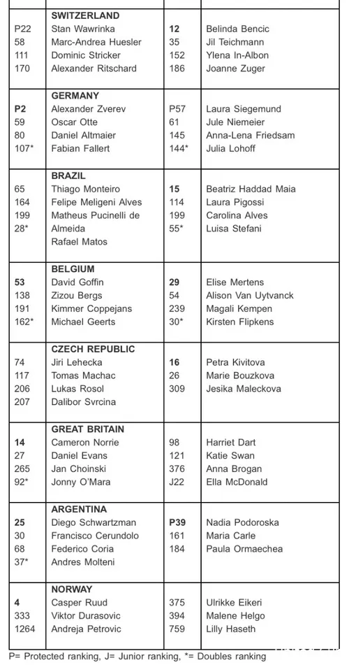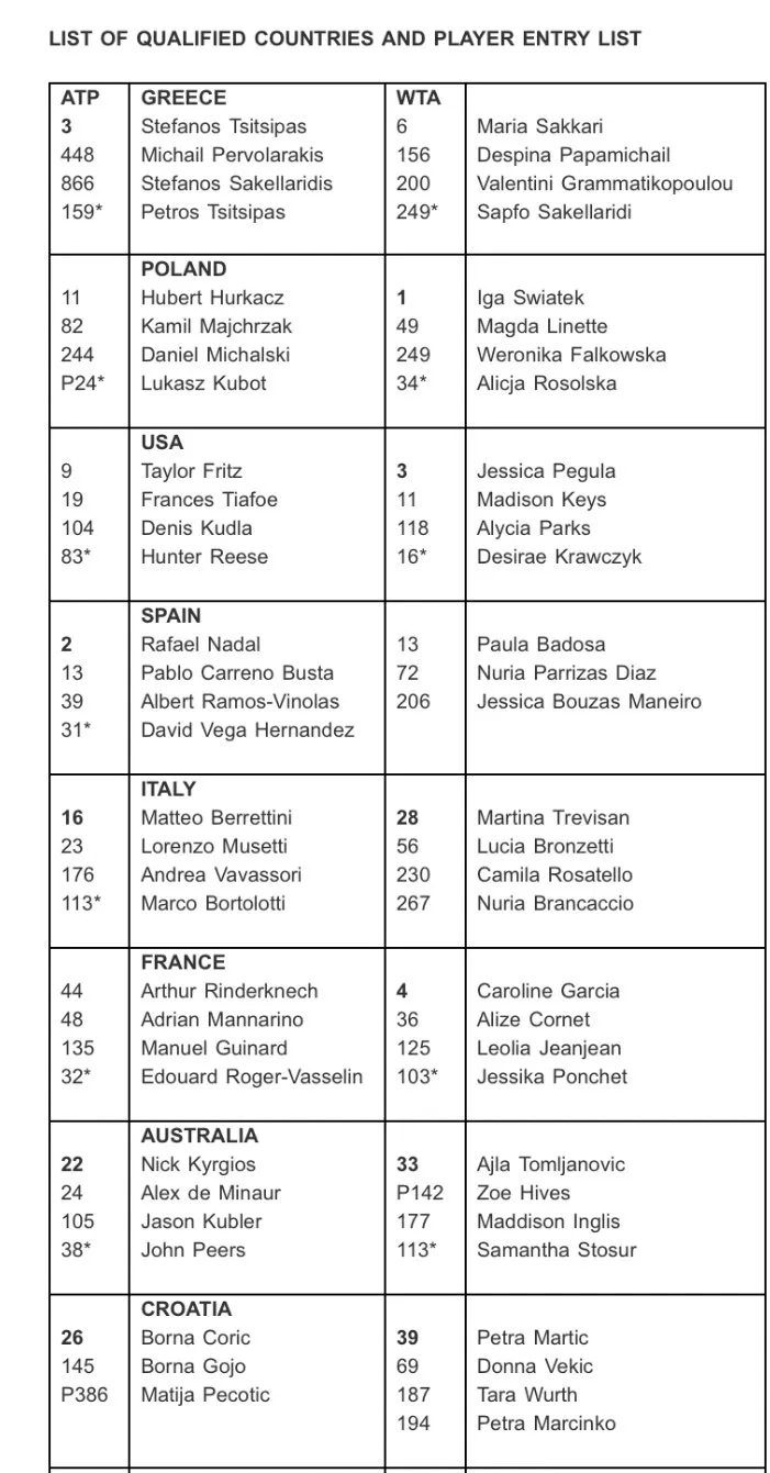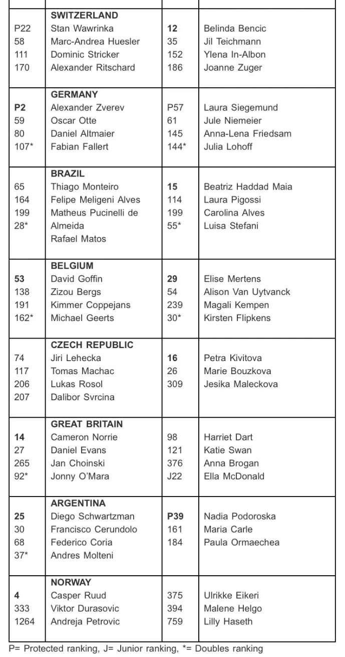 Other notable entries include Casper Ruud (Norway), Alexander Zverev (Germany), Belinda Bencic and Stan Wawrinka (Switzerland) and Petra Kvitova (Czech Republic).