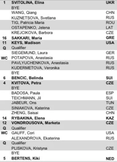 Svitolina plays against Qiang Wang or Svetlana Kuznetsova in the second round before a possible third-round Sakkari clash.