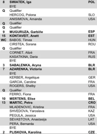 Karolina Pliskova. Elise Mertens and Petra Martic are also in contention, together with Kristina Mladenovic, Angelique Kerber and Caroline Garcia.