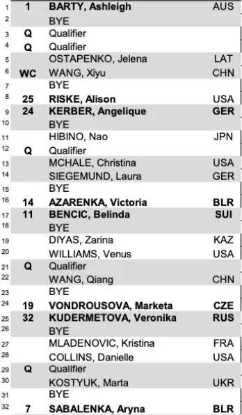 Simona Halep. In the top quarter, Barty will face Alison Riske, the three-time champion Victoria Azarenka, Belinda Bencic, Marketa Vondrousova and the 7th seed Aryna Sabalenka in the battle for the semis, with Venus Williams and Danielle Collins waiting for their chances as the unseeded players.