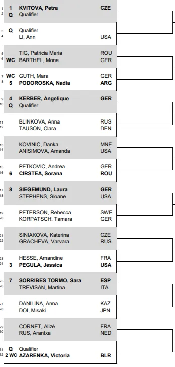 Both the prior mentioned Kvitova and Azarenka will face qualifiers in thier opening ties. While Pegula face Amandine Hesse of France.