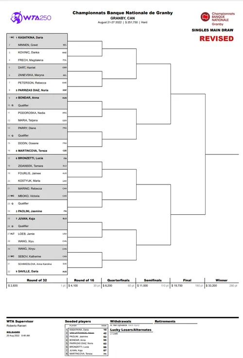 Some other interesting matchups include Bronzetti - Zidansek, Martincova - Dodin, Tatjana Maria - Nadia Podoroska, Zanevska - Dart and more. Check out the full draw below.