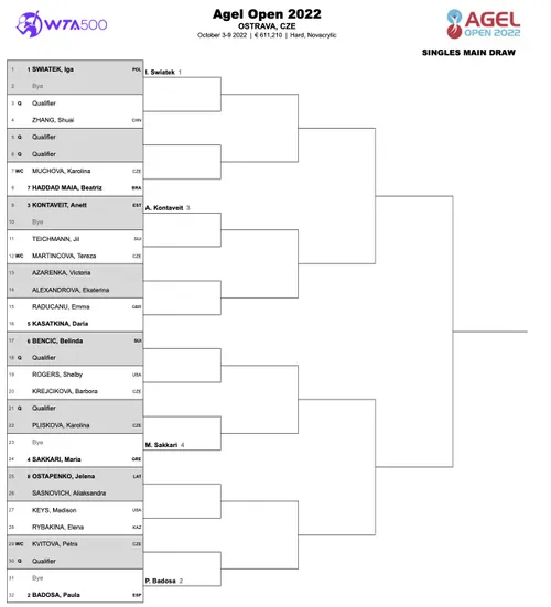 The event will be played indoors on hard courts and will run from October 3rd till October 9th. The top seed is Swiatek and she has a BYE in the first round. She might face Zhang or a qualifier in round two. The second seed is