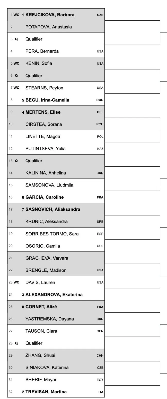 The 3rd seed is Ekaterina Alexandrova and she will begin agaisnt native Lauren Davis which should be an interesting one. Elise Mertens is the fourth seed and she will face Sorana Cirstea in round one. Other interesting matchups include Samsonova - Garcia, Linette - Putintseva, Osorio - Sorribes Tormo. Check out the full draw below.