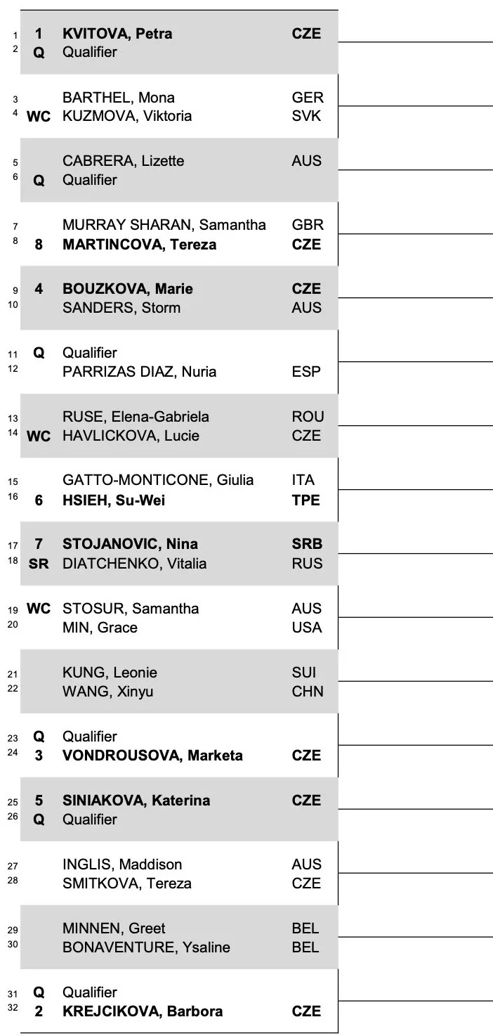 The 2nd seed will face a qualifier in the first round with either Minnen and Bonaventure waiting in R2. She might face doubles partner Siniakova in the quarterfinal which should be fun. The number one seed is Petra Kvitova who will look to improve on her poor Wimbledon showing.