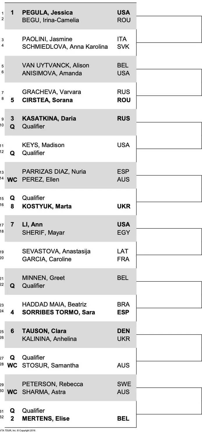 Elise Mertens receives a bye in the first round and will face Rebecca Peterson or Astra Sharma. Marta Kostyuk will face a qualifier then either Nuria Parrizas Diaz or Ellen Perez.