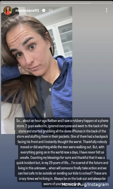 Puig witnessed two individuals robbing an iPhone store and detailed the event on social media. While watching in disbelief, one of the perpetrators put on a backpack, causing Puig to fear for her safety and assume the worst - that he was concealing a firearm. In her story, Puig detailed what had happened: