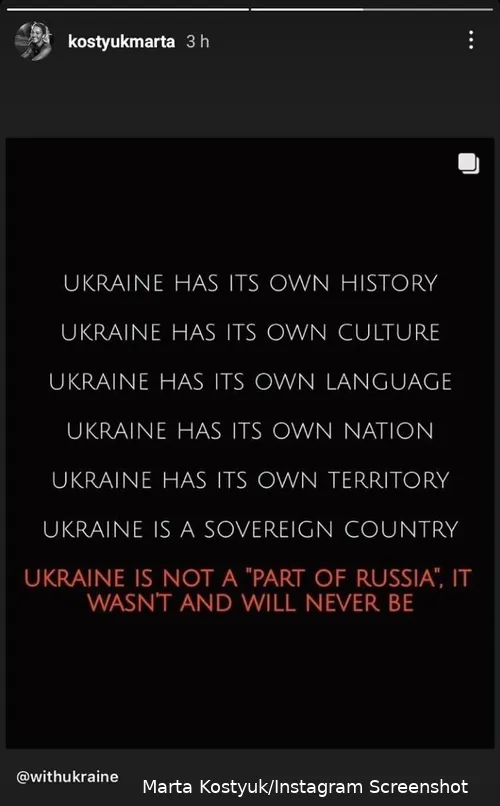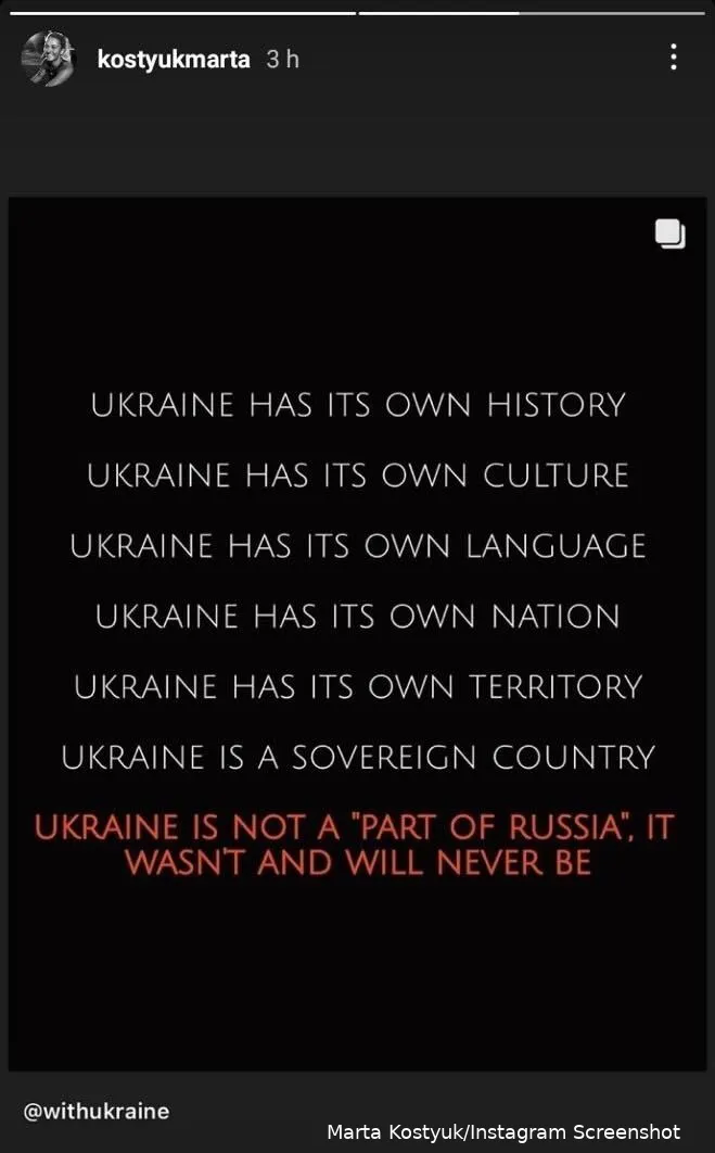 "Ukraine has its own History. Ukraine has its own Culture. Ukraine has its own Language. Ukraine has its own Nation," she shared on her Instagram story.