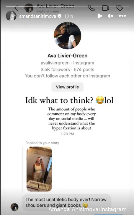Anisimova replied Thank you but posted on her story that she gets comments like this every day and doesn't get what the 'hyper fixation' is with her body.