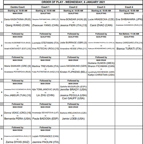 WTA 500 Abu Dhabi - Schedule of Play - Wednesday January 6: