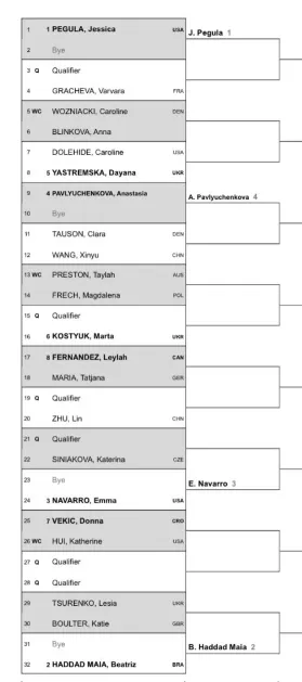 Pegula had a neck injury and had fans speculating she was pregnant which she denied and has also split with long-time coach, David Witt. She will face either a qualifier or Varvara Gracheva in the second round. Second seed is Beatriz Haddad Maia. She faces Lesia Tsurenko or Katie Boulter.