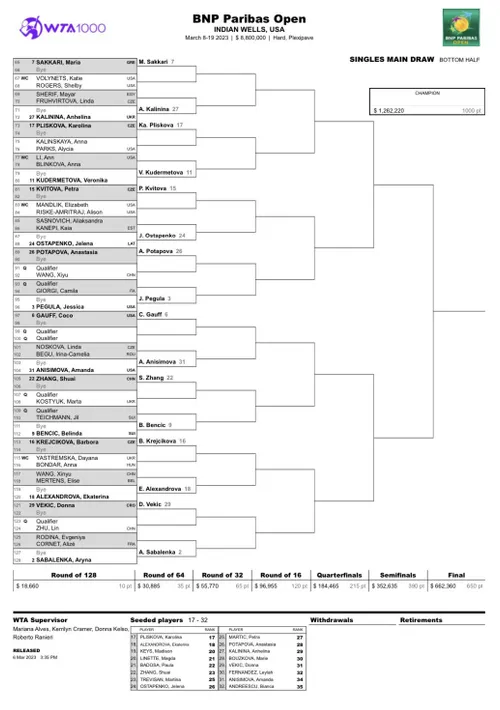 The WTA Draw has been confirmed for 2023 BNP Paribas Open