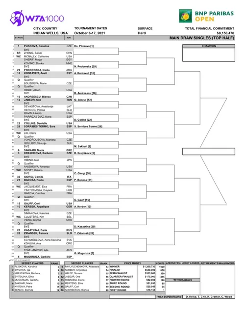Karolina Pliskova after the Covid-19 withdrawal of Aryna Sabalenka and she will face either Saisai Zheng or Caty McNally in her opener.